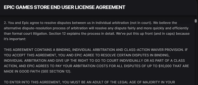 - Forced arbitration: Epic Games updated their Epic Games Store policy on 18 March 2022 to include forced arbitration in their Terms of Service. The users were required to agree to the new terms in order to continue using the platform. If a user did not agree to the new terms, they were effectively locked out of their library of previously purchased games and software.